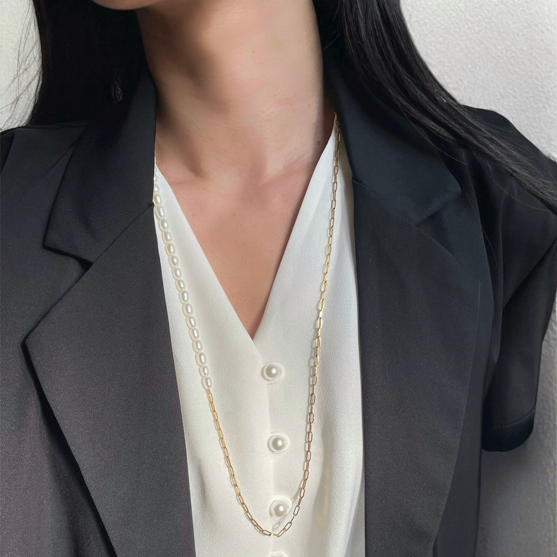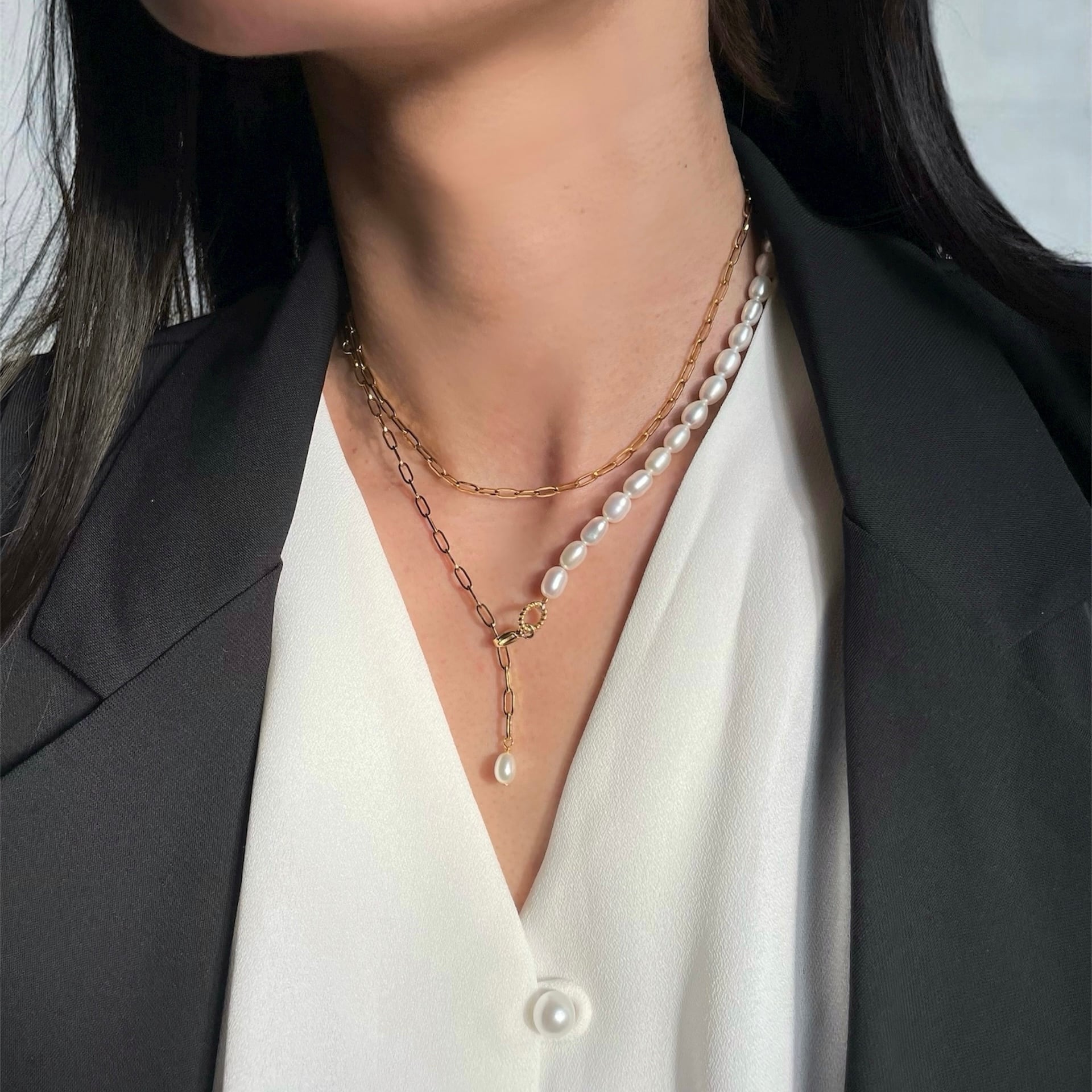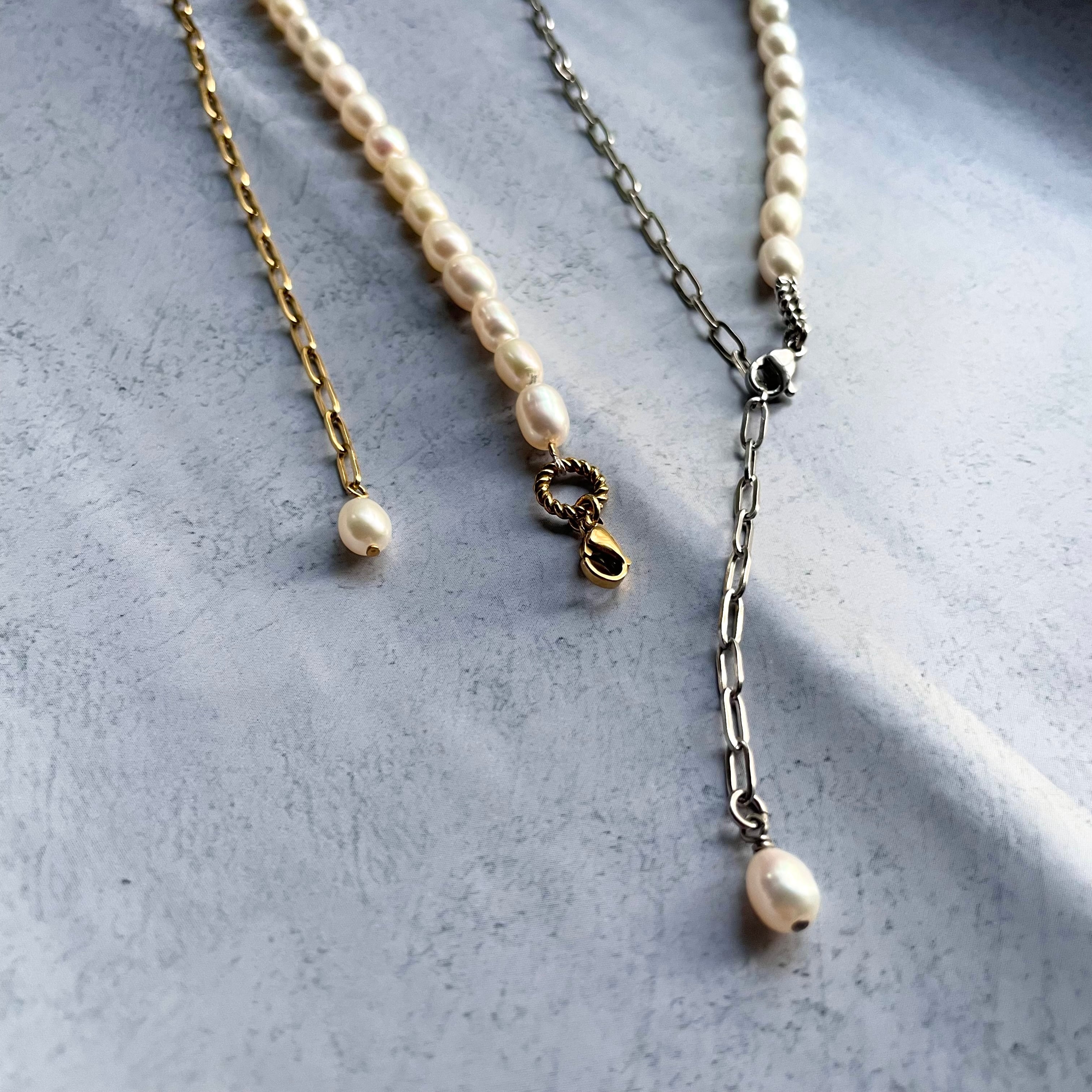 1粒1粒ほんの僅かに表情が異なるぷっくり淡水パール×スタイリッシュなオーバルチェーンの【アシンメトリー】