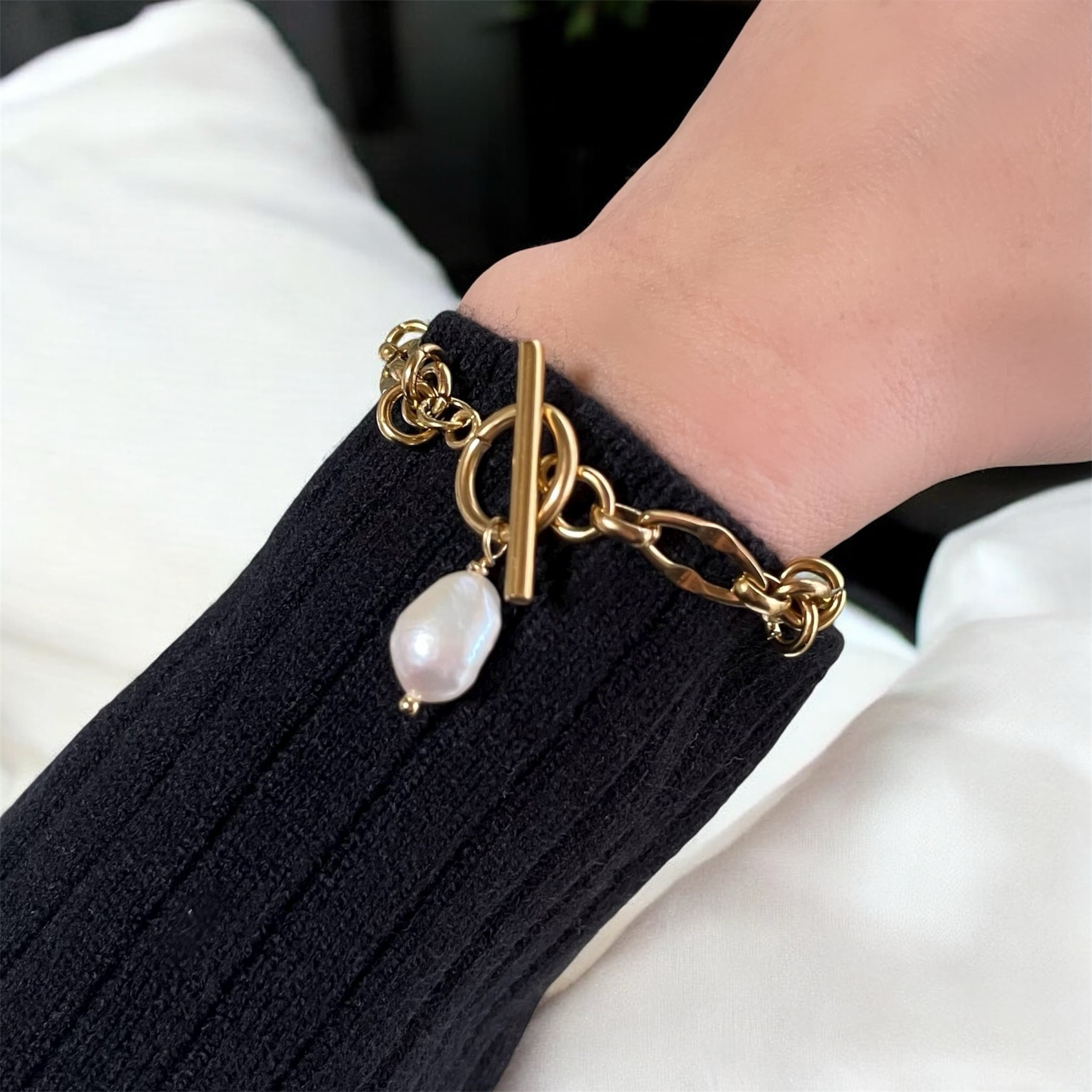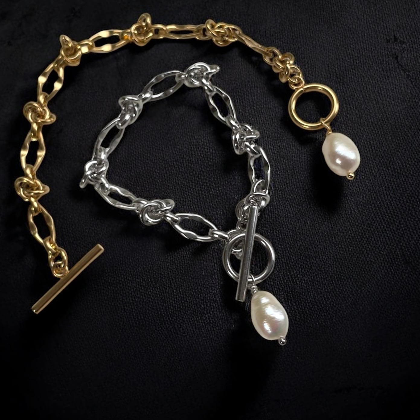 大振り◆バロックパール+ヴィンテージ チェーン マンテル ブレスレット◆金属アレルギー 対応/サージカルステンレス/淡水パール